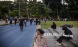 Seorang warga saat melakukan jogging di Taman Sempur, Kota Bogor, Jawa Barat, Sabtu (9/7/2022). Taman Sempur merupakan salah satu ruang publik yang dijadikan destinasi wisata alternatif bagi masyarakat untuk mengisi waktu liburan bersama keluarga pada Hari Raya Idul Adha. Republika/Putra M. Akbar (FOTO : Republika/Putra M. Akbar)