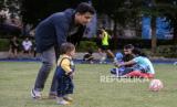 Sejumlah warga bermain bola di Taman Sempur, Kota Bogor, Jawa Barat, Sabtu (9/7/2022). Taman Sempur merupakan salah satu ruang publik yang dijadikan destinasi wisata alternatif bagi masyarakat untuk mengisi waktu liburan bersama keluarga pada Hari Raya Idul Adha. Republika/Putra M. Akbar (FOTO : Republika/Putra M. Akbar)