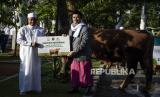 Wakil Gubernur Jawa Barat Uu Ruzhanul Ulum (kiri) memberikan hewan kurban kepada perwakilan DKM Masjid Raya Bandung usai pelaksanaan Shalat Idul Adha 1443 H di Jalan Diponegoro, Kota Bandung, Ahad (10/7/2022). Pemerintah Provinsi Jawa Barat menggelar Shalat Idul Adha 1443 H dengan sedikitnya terdata 86 ribu titik baik di masjid maupun di lapangan di seluruh Jawa Barat. (FOTO : REPUBLIKA/ABDAN SYAKURA)