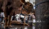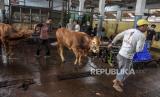 Petugas membawa sapi kurban yang akan disembelih di Rumah Potong Hewan (RPH) Ciroyom, Jalan Arjuna, Kota Bandung, Ahad (10/7/2022). Kementerian Agama mengeluarkan surat edaran tentang imbauan bagi umat Islam untuk melakukan penyembelihan hewan kurban Idul Adha 1443 H melalui RPH setempat sebagai upaya mencegah penyebaran penyakit mulut dan kuku (PMK). Per hari ini, Ahad (10/7/2022), RPH Ciroyom menyembelih hewan kurban sapi sebanyak 93 ekor sapi.  (FOTO : REPUBLIKA/ABDAN SYAKURA)
