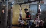 Petugas memotong daging sapi kurban di Rumah Potong Hewan (RPH) Ciroyom, Jalan Arjuna, Kota Bandung, Ahad (10/7/2022). Kementerian Agama mengeluarkan surat edaran tentang imbauan bagi umat Islam untuk melakukan penyembelihan hewan kurban Idul Adha 1443 H melalui RPH setempat sebagai upaya mencegah penyebaran penyakit mulut dan kuku (PMK). Per hari ini, Ahad (10/7/2022), RPH Ciroyom menyembelih hewan kurban sapi sebanyak 93 ekor sapi.  (FOTO : REPUBLIKA/ABDAN SYAKURA)