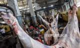 Petugas membawa daging sapi kurban di Rumah Potong Hewan (RPH) Ciroyom, Jalan Arjuna, Kota Bandung, Ahad (10/7/2022). Kementerian Agama mengeluarkan surat edaran tentang imbauan bagi umat Islam untuk melakukan penyembelihan hewan kurban Idul Adha 1443 H melalui RPH setempat sebagai upaya mencegah penyebaran penyakit mulut dan kuku (PMK). Per hari ini, Ahad (10/7/2022), RPH Ciroyom menyembelih hewan kurban sapi sebanyak 93 ekor sapi.  (FOTO : REPUBLIKA/ABDAN SYAKURA)
