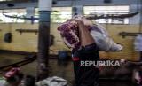 Petugas memotong daging sapi kurban di Rumah Potong Hewan (RPH) Ciroyom, Jalan Arjuna, Kota Bandung, Ahad (10/7/2022). Kementerian Agama mengeluarkan surat edaran tentang imbauan bagi umat Islam untuk melakukan penyembelihan hewan kurban Idul Adha 1443 H melalui RPH setempat sebagai upaya mencegah penyebaran penyakit mulut dan kuku (PMK). Per hari ini, Ahad (10/7/2022), RPH Ciroyom menyembelih hewan kurban sapi sebanyak 93 ekor sapi. (FOTO : REPUBLIKA/ABDAN SYAKURA)