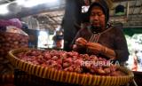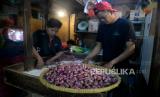 Pedagang menyortir bawang merah di Pasar Senen, Jakarta, Senin (11/7/2022). Menurut pedagang walau harga bawang merah mengalami penurunan sebesar Rp. 5.000 namun harga saat ini masih terbilang relatif tinggi yaitu Rp 65.000-Rp 70.000 ribu per kg. (FOTO : Prayogi/Republika.)