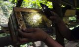 REPUBLIKA.CO.ID, JAKARTA -- Pengunjung melihat tetesan madu hasil budi daya lebah madu Trigona (Trigona sp) di Hutan Kota Srengseng, Kembangan, Jakarta, Senin (11/7/2022).