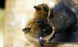 Sejumlah lebah madu Trigona (Trigona sp) berkumpul di pintu masuk sarang madu yang dibudidayakan di Hutan Kota Srengseng, Kembangan, Jakarta, Senin (11/7/2022). Dinas Pertamanan dan Hutan Kota DKI Jakarta membudidayakan lebah madu trigona (Trigona sp), lebah tanpa sengat sehingga tidak akan membahayakan pengunjung yang berwisata ke Hutan Kota Srengseng. (FOTO : ANTARA/Subur Atmamihardja)
