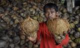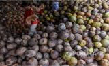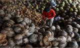 REPUBLIKA.CO.ID, CIAMIS -- Pekerja menunjukan kelapa yang sudah dikupas di Kampung Margaluyu, Kabupaten Ciamis, Jawa Barat, Selasa (12/7/2022). Dalam sehari pekerja mengupas 1.500 butir kelapa dengan upah Rp100 per butir. Sementara itu harga jual kelapa menurun dari Rp3.500 menjadi Rp1.500 per butir.