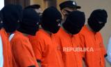 Tersangka kejahatan terhadap anak, eksploitasi dan distribusi materi pornografi dan kesusilaan korban anak melalui jaringan medsos dan meddol dihadirkan saat konferensi pers di Polda DIY, Rabu (13/7/2022). Sementara delapan tersangka ditahan dari kejahatan seksual daring terhadap anak oleh Polda DIY. Mereka dijerat dengan UU ITE dan UU KUHAP dengan ancaman 12 tahun penjara. Modus operandi tersangka yakni membagikan konten pornografi anak dan dewasa melalui grup WhatsApp dan grup Facebook. (FOTO : Wihdan Hidayat / Republika)