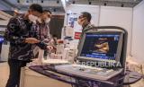 Pengunjung melihat sejumlah alat kesehatan yang dipajang pada pameran produk alat kesehatan dalam negeri di Sudirman Grand Ballroom, Jalan Jend Sudirman, Kota Bandung, Rabu (13/7/2022). Pameran yang digelar dalam rangka Gerakan Nasional Bangga Buatan Indonesia (BBI) tersebut menampilkan berbagai produk alat kesehatan seperti alat USG, antropometri, hospital bed serta umkm produk kesehatan lainnya dan digelar hingga 14 Juli mendatang. (FOTO : REPUBLIKA/ABDAN SYAKURA)