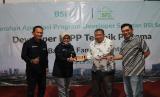 Direktur Manajemen Risiko BSI Tiwul Widyastuti (kedua kiri) menyerahkan logam mulia kepada Direktur PT Bangun Famili Sejahtera Muhdiyono (kedua kanan), didampingi SEVP Consumer Banking BSI Wawan Setiawan (kiri) dan Deputi Komisioner BP Tapera Bidang Pemanfaatan Dana Ariev Baginda Siregar (kanan) sebagai bentuk apresiasi dalam Program Developer Salaman BSI kategori pengembang FLPP terbaik pertama di Perumahan Griya Famili 4, Bekasi, Rabu (13/7/2022). (FOTO : Dok BSI)