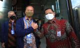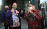 REPUBLIKA.CO.ID, JAKARTA -- Menteri Perindustrian Agus Gumiwang Kartasasmita (tengah) bersama Deputi Pendidikan dan Peran Serta Masyarakat KPK Wawan Wardiana (kanan) memberikan salam kepada wartawan seusai menghadiri pembekalan antikorupsi di Gedung Merah Putih KPK, Jakarta, Kamis (14/7/2022).
