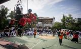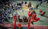 Relawan Muhammadiyah Disaster Management Center (MDMC) mempratekkan penyelamatan korban dari tempat ketinggian dengan teknik vertical resque pada kegiatan Penanggulangan Bencana Gempa Bumi di SMP Muhammadiyah Program Khusus, Solo, Jawa Tengah, Kamis (14/7/2022). Kegiatan tersebut sebagai edukasi dan pengetahuan kepada siswa tentang penanganan evakuasi penyelematan korban di ketinggian. (FOTO : ANTARA/Mohammad Ayudha)