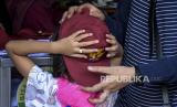 Seorang anak bersama orang tuanya mencoba topi sekolah di salah satu toko seragam di Jalan Cipaera, Lengkong, Kota Bandung, Jumat (15/7/2022). Pedagang di kawasan tersebut menyatakan, jelang pembelajaran tatap muka tahun ajaran 2022/2023 di Kota Bandung, penjualan seragam sekolah meningkat 75 persen hingga 90 persen atau setara dengan 150 setel seragam per hari dibandingkan dengan tahun sebelumnya. (FOTO : REPUBLIKA/ABDAN SYAKURA)
