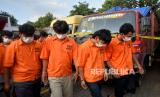 Polisi menghadirkan para tersangka saat rilis terkait penyalahgunaan LPG bersubsidi di Jakarta, Jumat (15/7/2022). Direktorat Tindak Pidana Tertentu Bareskrim Polri berhasil mengungkap kasus terkait penyalahgunaan LPG bersubsidi dengan modus operandi menyuntikan gas 3 Kg bersubsidi ke tabung gas ukuran 5,5 kg, 12 kg dan 50 kg yang dijual dengan harga non subsidi berjumlah 3.344 tabung. (FOTO : Prayogi/Republika.)
