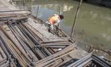 Pekerja menyelesaikan pembangunan turap anak sungai Ciliwung di Jakarta, Jumat (15/7/2022). Pembangunan turap di beberapa aliran sungai tersebut sebagai bentuk upaya Pemprov DKI Jakarta dalam pengendalian banjir di Ibu Kota. (FOTO : ANTARA/Muhammad Adimaja)