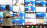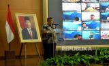 Direktur Utama BPJS Ketenagakerjaan Anggoro Eko Cahyo memberikan sambutan dalam acara penyerahan santunan kepada ahli waris atau keluarga pegawai Non ASN di lingkungan BPKP yang meninggal dunia di Kantor Pusat BPKP Jakarta, Jumat (15/7). (FOTO : Prayogi/Republika.)