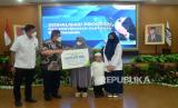 Kepala Badan Pengawasan Keuangan dan Pembangunan (BPKP) Muhammad Yusuf Ateh (dua kiri) bersama Direktur Utama BPJS Ketenagakerjaan Anggoro Eko Cahyo (kiri) menyerahkan santunan kepada ahli waris atau keluarga pegawai Non ASN di lingkungan BPKP yang meninggal dunia di Kantor Pusat BPKP Jakarta, Jumat (15/7). (FOTO : Prayogi/Republika. )