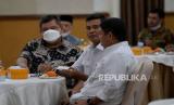 Kepala Badan Pengawasan Keuangan dan Pembangunan (BPKP) Muhammad Yusuf Ateh (kiri) bersama Direktur Utama BPJS Ketenagakerjaan Anggoro Eko Cahyo (tengah) saat hadir dalam acara penyerahan santunan kepada ahli waris atau keluarga pegawai Non ASN di lingkungan BPKP yang meninggal dunia di Kantor Pusat BPKP Jakarta, Jumat (15/7). (FOTO : Prayogi/Republika.)