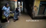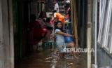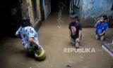 Warga dan anak-anak melintasi banjir yang merendam kawasan Kebon Pala, Kampung Melayu, Jakarta, Sabtu (16/7/2022). Banjir setinggi 40-170 centimeter tersebut terjadi akibat meluapnya air sungai Ciliwung yang dipicu oleh tingginya curah hujan yang mengguyur wilayah Jakarta, Bogor, dan Depok sejak Jumat (15/7/2022) malam hingga Sabtu pagi.Prayogi/Republika. (FOTO : Prayogi/Republika.)