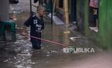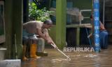 Seorang anak membersihkan lumpur sisa banjir yang terjadi di Kebon Pala, Kampung Melayu, Jakarta, Sabtu (16/7/2022). Banjir setinggi 40-170 centimeter tersebut terjadi akibat meluapnya air sungai Ciliwung yang dipicu oleh tingginya curah hujan yang mengguyur wilayah Jakarta, Bogor, dan Depok sejak Jumat (15/7/2022) malam hingga Sabtu pagi.Prayogi/Republika. (FOTO : Prayogi/Republika.)