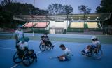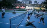 REPUBLIKA.CO.ID, SOLO -- Atlet tenis kursi roda Indonesia beserta offisial mencoba Lapangan Tenis Manahan, Solo, Jawa Tengah, Sabtu (16/7/2022). Proyek revitalisasi sarana dan prasarana pendukung di Lapangan Tenis Manahan telah selesai dikerjakan dan siap digunakan untuk ASEAN Para Games 2022 pada 30 Juli hingga 6 Agustus mendatang.