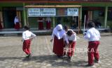 Siswa bermain saat jam istirahat di SDN Banyurejo 4, Tempel, Sleman, Yogyakarta, Senin (18/7/2022). Mulai pekan ini kegiatan belajar mengajar mulai secara penuh dilakukan. Tahun ajaran 2022/2023 SDN Banyurejo 4 mendapat 2 murid baru dan titipan satu murid. SDN Banyurejo 4 saat ini memiliki 29 jumlah murid. Penyebab sedikitnya murid baru karena desa sekitar sekolah tidak memiliki anak usia masuk SD. (FOTO : Wihdan Hidayat / Republika)