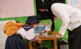 Seorang siswi dibantu oleh gurunya sedang mencuci tangan sebelum mamasuki area bermain di TK Inkulusi Bhakti Siwi, Sunter Jaya, Jakarta, di hari pertamanya masuk sekolah, Senin (18/7/2022). TK Inklusi Bhakti Siwi berbasis lingkungan ini menerapkan kurikulum ‘Merdeka Belajar’ yang merupakan satu-satunya TK Inklusi di wilayah Sunter Jaya Jakarta Utara. Foto: Darmawan/Republika (FOTO : REPUBLIKA)