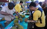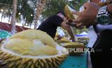 REPUBLIKA.CO.ID, ACEH JAYA -- Petugas membuka buah durian saat festival dan lomba durian di Desa Dayah Baro, Krueng Sabee, Aceh Jaya, Aceh, Senin (18/7/2022). Festival dan lomba durian yang diselenggarakan Pemerintah Kabupaten Aceh Jaya bekerjasama dengan Durian Traveler Indonesia tersebut diikuti 60 peserta dengan 60 varian durian dengan tujuan untuk mempromosikan wisata kabupaten setempat.