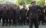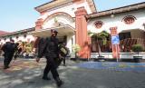 REPUBLIKA.CO.ID, Personel Korps Brimob berjaga di area Gedung Pengadilan Negeri Surabaya Jalan Arjuno, Surabaya, Jawa Timur, Senin (18/7/2022). Sebanyak 405 anggota kepolisian dikerahkan untuk mengamankan jalannya sidang perdana dengan agenda pembacaan dakwaan dengan terdakwa berinisial MSAT yang terjerat dalam perkara dugaan pencabulan.