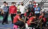 Menteri Pemuda dan Olahraga Zainudin Amali (kiri) didampingi Ketua Indonesia ASEAN Para Games Organizing Committee (Inaspoc) Gibran Rakabuming Raka (kedua kiri) melihat latihan atlet Boccia sekaligus mencoba venue di Gor Fakutas Keolahrgaan (FKOR) UNS , Solo, Jawa Tengah, Senin (18/7/2022). Renovasi sejumlah venue olahraga yang dikerjakan dalam waktu 45 hari kerja, secara umum telah selesai dikerjakan dan siap digunakan untuk penyelengaraan ASEAN Paragames 2022 pada 30 Juli hingga 6 Agustus mendatang. (FOTO : ANTARA/Mohammad Ayudha)