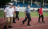 Menteri Pemuda dan Olahraga Zainudin Amali (tengah) didampingi Ketua Indonesia ASEAN Para Games Organizing Committee (Inaspoc) Gibran Rakabuming Raka (kanan) meninjau venue Para-Sepak Bola di Stadion UNS , Solo, Jawa Tengah, Senin (18/7/2022). Renovasi sejumlah venue olahraga yang dikerjakan dalam waktu 45 hari kerja, secara umum telah selesai dikerjakan dan siap digunakan untuk penyelengaraan ASEAN Paragames 2022 pada 30 Juli hingga 6 Agustus mendatang. (FOTO : ANTARA/Mohammad Ayudha)