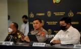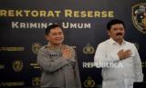 REPUBLIKA.CO.ID, JAKARTA -- Kapolda Metro Jaya Irjen Fadil Imran (dua kiri) bersama Menteri Agraria Tata Ruang / Kepala Badan Pertahanan Nasional (ATR/BPN) Hadi Tjahjanto (dua kanan) memberikan keterangan saat rilis kasus mafia tanah di Mapolda Metro Jaya, Senin (18/7/2022). Dalam rilis kasus mafia tanah tersebut pihak kepolisian berhasil menahan 25 tersangka dari 30 tersangka mafia tanah.