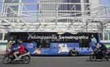 REPUBLIKA.CO.ID,JAKARTA -- Bus TransJakarta melintas di dekat proyek revitalisasi Halte TransJakarta Bundaran Hotel Indonesia di Jakarta, Senin (18/7/2022).
