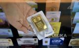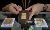 Karyawan menunjukkan logam mulia yang dijual di Galeri 24 Pegadaian, Jakarta, Selasa (19/7/2022). Dalam sepakan terakhir, harga emas lebih berkutat di zona negatif karena menguatnya dolar Amerika Serikat (AS) serta ekspektasi kenaikan suku bunga acuan bank sentral AS The Federal Reserve (The Fed). Tercatat dalam sepekan tersebut harga emas sudah menyusut 1,05% secara point to point. Dalam sebulan, harga emas juga amblas 7,11 % sementara dalam setahun ambruk 5,78%. (FOTO : Prayogi/Republika.)