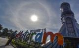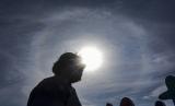 REPUBLIKA.CO.ID, MATARAM -- Seorang laki-laki berdiri di areal tugu Mataram Metro dengan latar belakang Halo Matahari di Mataram, NTB, Selasa (19/7/2022). Halo matahari merupakan fenomena optis berupa cahaya melingkar di sekitar matahari yang disebabkan oleh bereaksinya uap air yang terkandung diawan dengan sinar matahari.