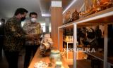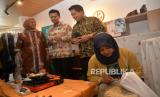 Direktur Utama Bank Syariah Indonesia Hery Gunardi (dua kanan),Wakil Gubernur Jawa Timur Emil Dardak (dua kiri) dan Founder Ulur Wiji Batik Nasta Rofika (kiri) berbincang saat meninjau produk UMKM yang berada di BSI UMKM Center Surabaya usai peresmiannya di Surabaya, Jawa Timur, Kamis (21/7/2022). BSI UMKM Center Surabaya ini merupakan salah satu upaya BSI dalam membentuk ekosistem UMKM yang unggul dan berkualitas, sehingga dapat meningkatkan kapasitas dan kapabilitas pelaku usaha. Selain itu UMKM Center BSI juga diharapkan menjadi wadah bagi pelaku UMKM agar mendapatkan pelatihan, pembinaan, pembiayaan hingga membantu proses pemasaran produk. (FOTO : Prayogi/Republika.)