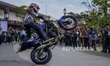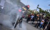 Pegiat otomotif melakukan aksi freestyle motor pada pameran inovasi otomotif Kodam III/Siliwangi di Kiara Artha Park, Kota Bandung, Jumat (22/7/2022). Pameran inovasi otomotif yang digelar Kodam III/Siliwangi dan diikuti oleh berbagai komunitas otomotif tersebut dalam rangka memeriahkan serta rangkaian peringatan HUT Kemerdekaan ke-77 Republik Indonesia.  (FOTO : REPUBLIKA/ABDAN SYAKURA)