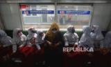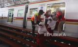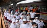 Sejumlah siswa turun dari KRL di Stasiun Tanjung Priok, Jakarta, Jumat (22/7/2022). KAI Commuter mengadakan kegiatan lomba mewarnai dan memberikan edukasi tentang KRL untuk mengenalkan moda transportasi kereta kepada pelajar  dalam rangka memperingati Hari Anak Nasional.  (FOTO : Republika/Putra M. Akbar)