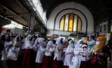 REPUBLIKA.CO.ID, JAKARTA -- Petugas memberikan pengarahan kepada siswa yang mengikuti lomba mewarnai di Stasiun Jakarta Kota, Jakarta, Jumat (22/7/2022). KAI Commuter mengadakan kegiatan lomba mewarnai dan memberikan edukasi tentang KRL untuk mengenalkan moda transportasi kereta kepada pelajar dalam rangka memperingati Hari Anak Nasional.