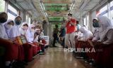 Sejumlah siswa menaiki KRL menuju Stasiun Tanjung Priok di Jakarta, Jumat (22/7/2022). KAI Commuter mengadakan kegiatan lomba mewarnai dan memberikan edukasi tentang KRL untuk mengenalkan moda transportasi kereta kepada pelajar  dalam rangka memperingati Hari Anak Nasional.  (FOTO : Republika/Putra M. Akbar)