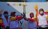 Bupati Grobogan Sri Sumarni (kedua kanan) menyerahkan api obor kepada atlet disabiltas peraih medali emas Pekan Paralimpic Provinsi (Peparprov) 2018 cabang renang Solikan (kedua kiri) saat prosesi pengambilan dari sumber Api Abadi Mrapen, Desa Manggarmas, Godong, Grobogan, Jawa Tengah, Sabtu (23/7/2022). Api obor tersebut kemudian dikirab melewati empat kota yaitu Semarang, Sukoharjo, Karanganyar dan berakhir di kota Solo untuk pembukaan ajang ASEAN Para Games ke-11 pada 30 Juli 2022 di Stadion Manahan Solo. (FOTO : ANTARA/Yusuf Nugroho)
