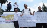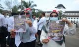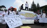 Puluhan guru honorer dari berbagai daerah di Jawa Barat menggelar aksi di depan Gedung Sate, Kota Bandung, Senin (25/7). Mereka meminta kejelasan terkait guru honorer yang sudah menjalani uji passing grade, tetapi belum kunjung diangkat menjadi Pegawai Pemerintah dengan Perjanjian Kerja (PPPK). Jumlah guru yang telah lulus passing grade di Jawa Barat mencapai 10.397 orang. Namun, hanya 6.425 yang mendapatkan kepastian penempatan. Selebihnya, belum pasti. (FOTO : Edi Yusuf/Republika)