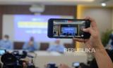 Jurnalis merekam Plt Dirjen Kekayaan Intelektual (KI) Kemenkumham Razilu (tengah) didampingi Direktur Merek dan Indikasi Geografis Kemenkumham Kurniaman Telaumbanua (kiri) dan Kepala Biro Humas, Hukum dan Kerja Sama Kemenkumham Hantor Situmorang (kanan) menyampaikan konferensi pers isu-isu terkini terkait kekayaan intelektual di Jakarta, Selasa (26/7/2022). Razilu menekankan bahwa semua orang berhak mengajukan permohonan kekayaan intelektual (KI) termasuk merek, namun demikian tidak semua permohonan merek dapat disetujui atau dikabulkan. Republika/Putra M. Akbar (FOTO : Republika/Putra M. Akbar)