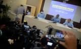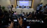 Plt Dirjen Kekayaan Intelektual (KI) Kemenkumham Razilu (tengah) didampingi Direktur Merek dan Indikasi Geografis Kemenkumham Kurniaman Telaumbanua (tengah kiri) dan Kepala Biro Humas, Hukum dan Kerja Sama Kemenkumham Hantor Situmorang (tengah kanan) menyampaikan konferensi pers isu-isu terkini terkait kekayaan intelektual di Jakarta, Selasa (26/7/2022). Razilu menekankan bahwa semua orang berhak mengajukan permohonan kekayaan intelektual (KI) termasuk merek, namun demikian tidak semua permohonan merek dapat disetujui atau dikabulkan. Republika/Putra M. Akbar (FOTO : Republika/Putra M. Akbar)