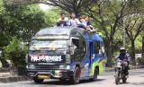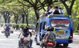 Mereka menumpang di atas atap mobil angkutan umum melintas di jalanan Tangerang. .