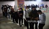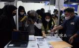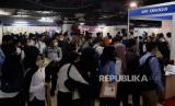 Warga mengantre untuk mencari informasi lowongan pekerjaan saat Jakarta Job Fair di kawasan Blok M, Jakarta, Rabu (27/7/2022). Suku Dinas Tenaga Kerja, Transmigrasi dan Energi di lima wilayah Kota Administrasi menyelenggarakan pameran bursa kerja pada 27 Juli hingga 11 Agustus 2022. Kegiatan yang diikuti lebih dari 200 perusahaan itu menyediakan sekitar 20.000 lowongan pekerjaan. (FOTO : Republika/Putra M. Akbar)