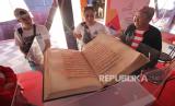 Petugas menjelaskan kepada wisatawan asing salah satu koleksi Museum Keraton Sumenep berupa Al Quran 30 Juz tulisan tangan Raja Sumenep ke-32 Sultan Abdurrrahman Pakunataningrat saat pameran Cross Musea Klasik Nusantara 2022 di Museum 10 Nopember kompleks Tugu Pahlawan, Surabaya, Jawa Timur, Rabu (27/7/2022). Pameran yang berlangsung hingga 28 Juli 2022 tersebut bertujuan untuk mengenalkan sejarah dan keragaman budaya Indonesia sekaligus menjadi sarana pembelajaran di luar ruangan bagi para pelajar. (FOTO : ANTARA/Moch Asim)
