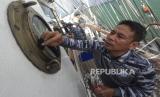 REPUBLIKA.CO.ID, BATAM -- Awak KRI Bima Suci-945 membersihkan kaca pintu anjungan KRI Bima Suci-945 saat lego jangkar di Perairan Laut Batam, Kepulauan Riau (Kepri), Rabu (27/7/2022).