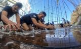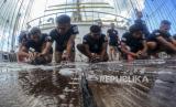 Taruna Akademi Angkatan Laut (AAL) Tingkat III Angkatan ke-69 membersihkan geladak KRI Bima Suci-945 dengan menggunakan batok kelapa saat lego jangkar di Perairan Laut Batam, Kepulauan Riau (Kepri), Rabu (27/7/2022). Pembersihan tersebut merupakan bentuk dari kedisiplinan prajurit dalam menumbuhkan rasa kepedulian terhadap kebersihan dan kerapian alutsita yang diawakinya. (FOTO : ANTARA/Nova Wahyudi)