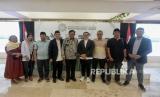 Pemimpin Redaksi Republika Irfan Junaidi (ketiga kanan) bersama Direktur Utama Istiqlal Global Fund (IGF) Mulyono Lodgi (keempat kanan), Sekretaris Lembaga Pemuliaan Lingkungan Hidup (LPLH) MUI, Hidayat Tri Sutardjo (keempat kiri) dan sejumlah perwakilan organisasi keagaaman berseta Universitas lainnya berfoto bersama saat kegiatan Kongres Umat Islam untuk Indonesia Lestari di Aula Al-Fatah Masjid Istiqlal, Jakarta, Kamis (28/7/2022). Kongres tersebut diikuti oleh sejumlah organisasi keagamaan, Universitas dan Republika dengan tujuan menggagas peran umat islam dalam penanganan perubahan iklim di tengah situasi krisis iklim. (FOTO : Republika/Thoudy Badai)